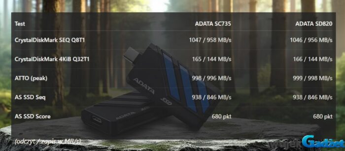 Na laptopie z portem USB 3.1 Gen 1 oba dyski osiągnęły maksymalny możliwy transfer (~1000 MB/s), więc nie zobaczymy różnicy między SC735 a SD820.