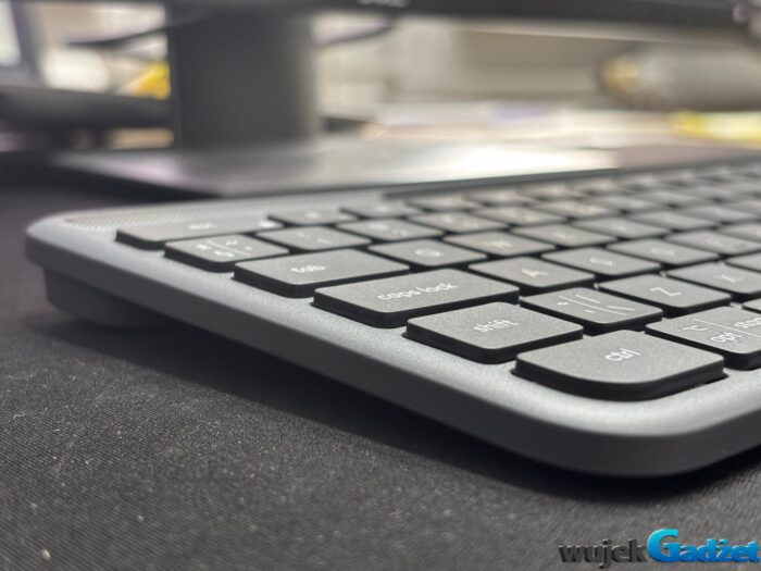 Co charakterystyczne: profil jest niski. To nie jest klawiatura mechaniczna ani „głośny” sprzęt do pisania. Brak rozbudowanych nóżek regulujących kąt (w praktyce jedna, stała pozycja) to świadomy kompromis – ergonomia jest w porządku, ale ktoś, kto lubi podwyższać spód, może czuć niedosyt. W zamian otrzymujemy schludną sylwetkę, która ładnie wygląda na biurku.