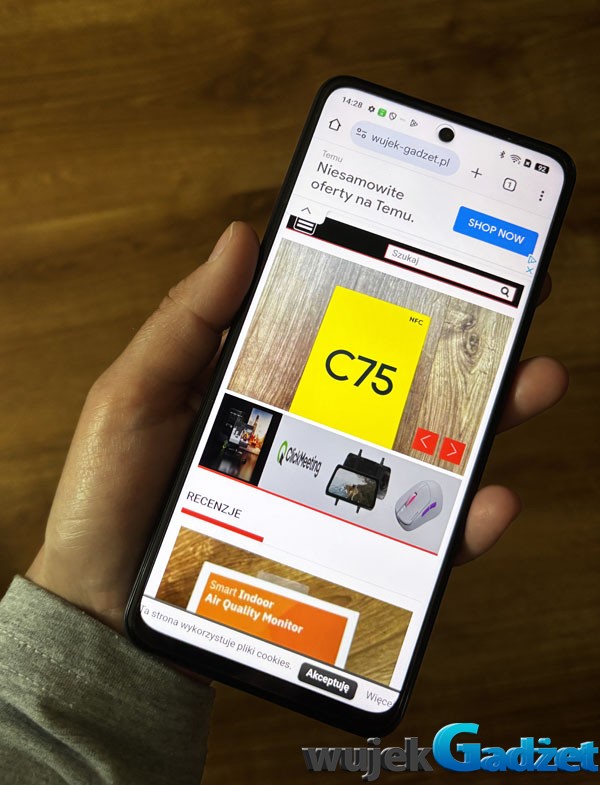 Wyświetlacz LCD o przekątnej 6,67 cala i rozdzielczości HD+ (1604×720 px) może nie powala szczegółowością, ale nadrabia płynnością – dzięki odświeżaniu 120 Hz. Wrażenia podczas scrollowania czy przeglądania treści są bardzo dobre. Panel ma też przyzwoitą jasność (625 nitów) i kontrast 1500:1. Kolory są całkiem naturalne, a różne tryby ochrony wzroku (w tym filtr niebieskiego światła) poprawiają komfort podczas długiego korzystania z telefonu.