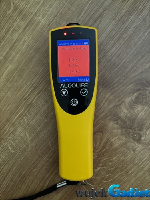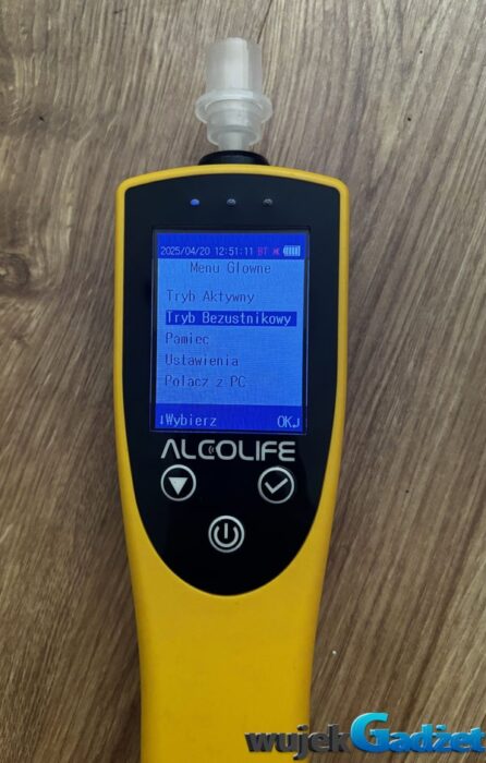 Warto dodać, że w trybie bezustnikowym alkomat wykazuje większą czułość na obecność alkoholu – już przy wyniku 0,09‰ wyświetlacz zmienia kolor na czerwony. To celowe działanie, mające na celu ostrzeżenie użytkownika i zasygnalizowanie potrzeby wykonania dokładniejszego badania w trybie ustnikowym. Tryb pasywny służy bowiem jedynie do szybkich testów przesiewowych i nie zastępuje dokładnego pomiaru.